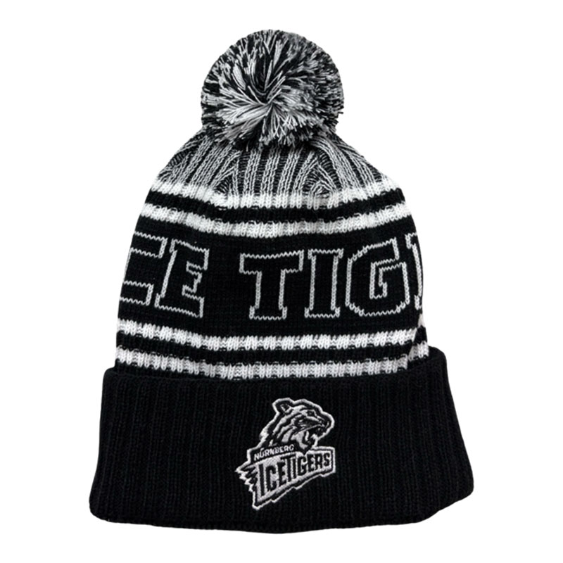 hochwertige Logo-Stickerei in schwarz und grau mit Bommel