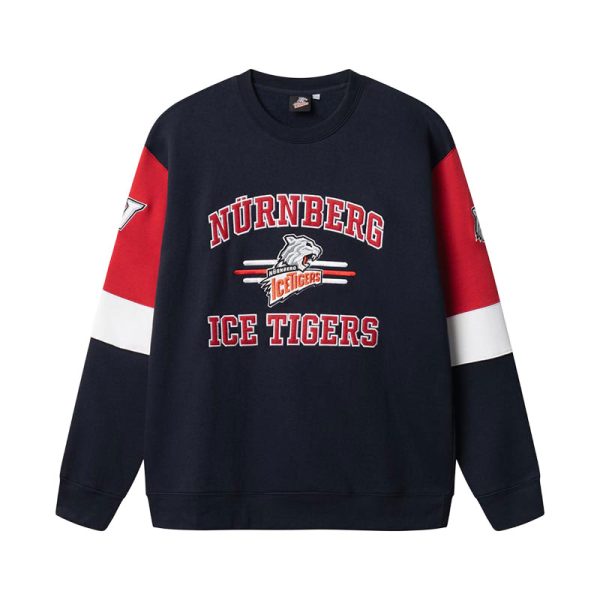 Hochwertiges Block Crewneck Sweatshirt in navy mit großer Frontstickerei im Design der Nürnberg Ice Tigers, sowie Direkteinstickungen des NIT-Logos sowie des Alternate-Logos auf den Ärmeln.
