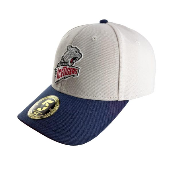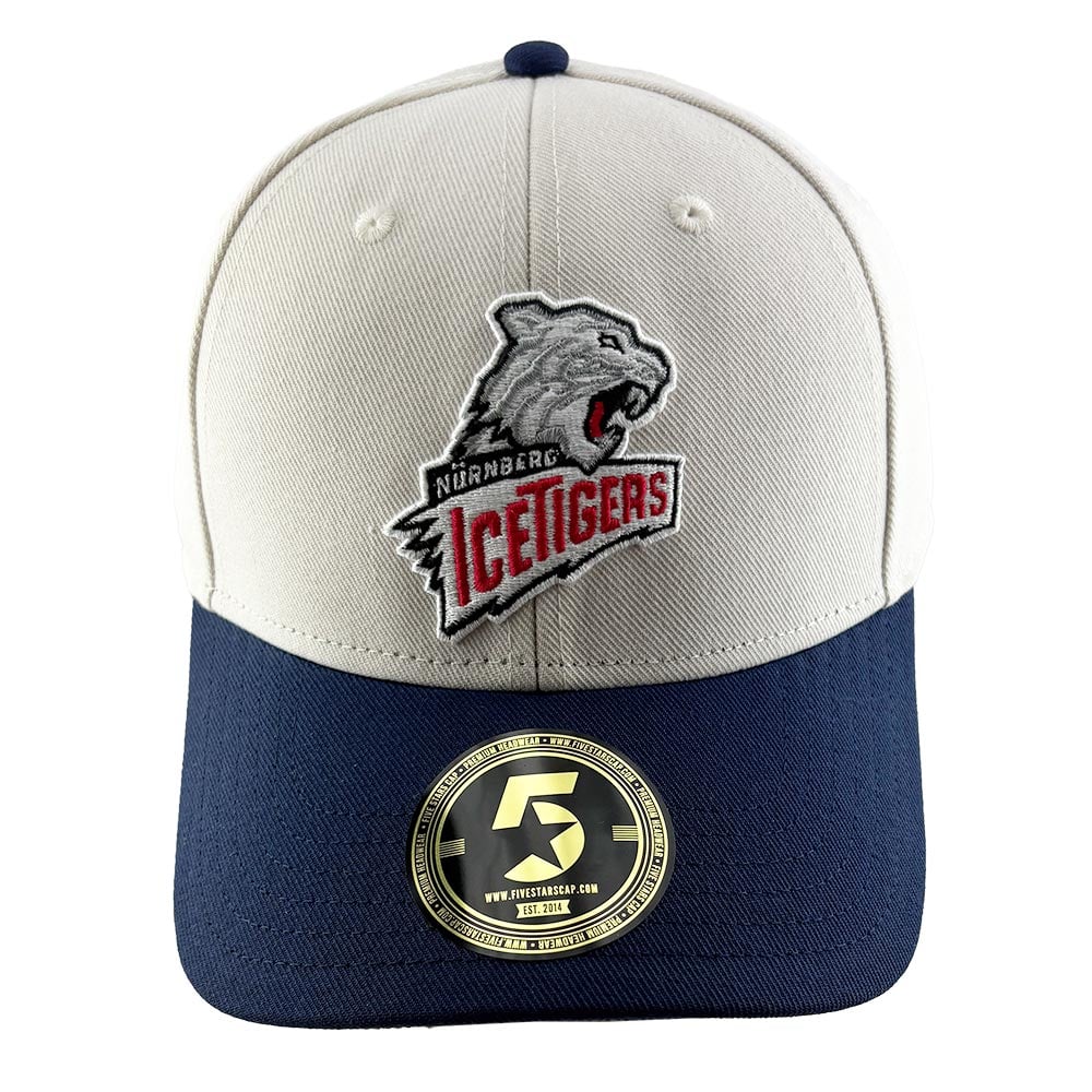 Curved Snapback Cap von FiveStars mit hochwertigem, gesticktem Ice Tigers-Logo auf der Front und Tigerkopf seitlich.