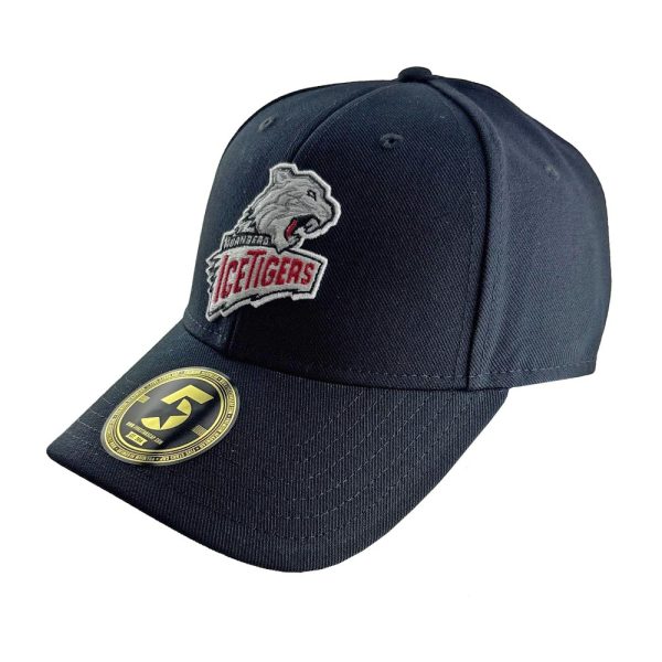 Curved Snapback Cap von FiveStars mit hochwertigem, gesticktem Ice Tigers-Logo auf der Front und Tigerkopf seitlich.